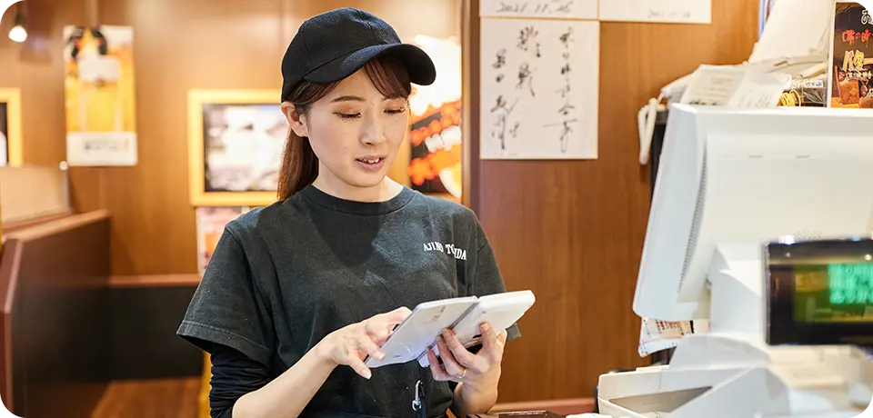 お客様を席にご案内したり、注文を取ったり、お料理を提供したり、最後のお会計まで担当しています。いわゆるホールスタッフのお仕事ですけど、忙しい時間帯になるとチームで協力して動くので、いつも活気があって楽しいです。