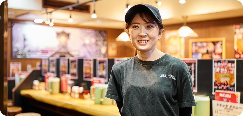 この仕事が私にとって初めての社会経験だったんですけど、挨拶や接客の基本からしっかり教えてもらえたので、今では自信を持ってお客様に対応できるようになりました。最近はキッチンも手伝うようになって、包丁の使い方や仕込みのコツを教わりながら、少しずつスキルが増えていくのが楽しいです。